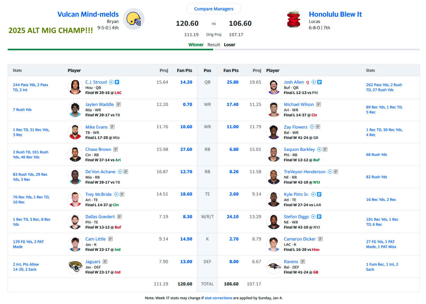 "Ahem, yes, the player data we've contabulated on the right using advanced statistical measures of the most standard of deviations known to man shows those individuals that - unlike that confounded monkey, with the biting, and the scratching, and the DEAR GOD he's GOTTEN INTO THE mainframe! - Where was I, oh yes, the data you see on the right shows the individual players that showed up consistently in the scoring columns week after week. We systematically excluded players that had started in under 60% of the season's games and also those averaging less than 50% of the best player's points per game. Good glayvin, this took a lot of work."Best MIG QB of 2025 | |||