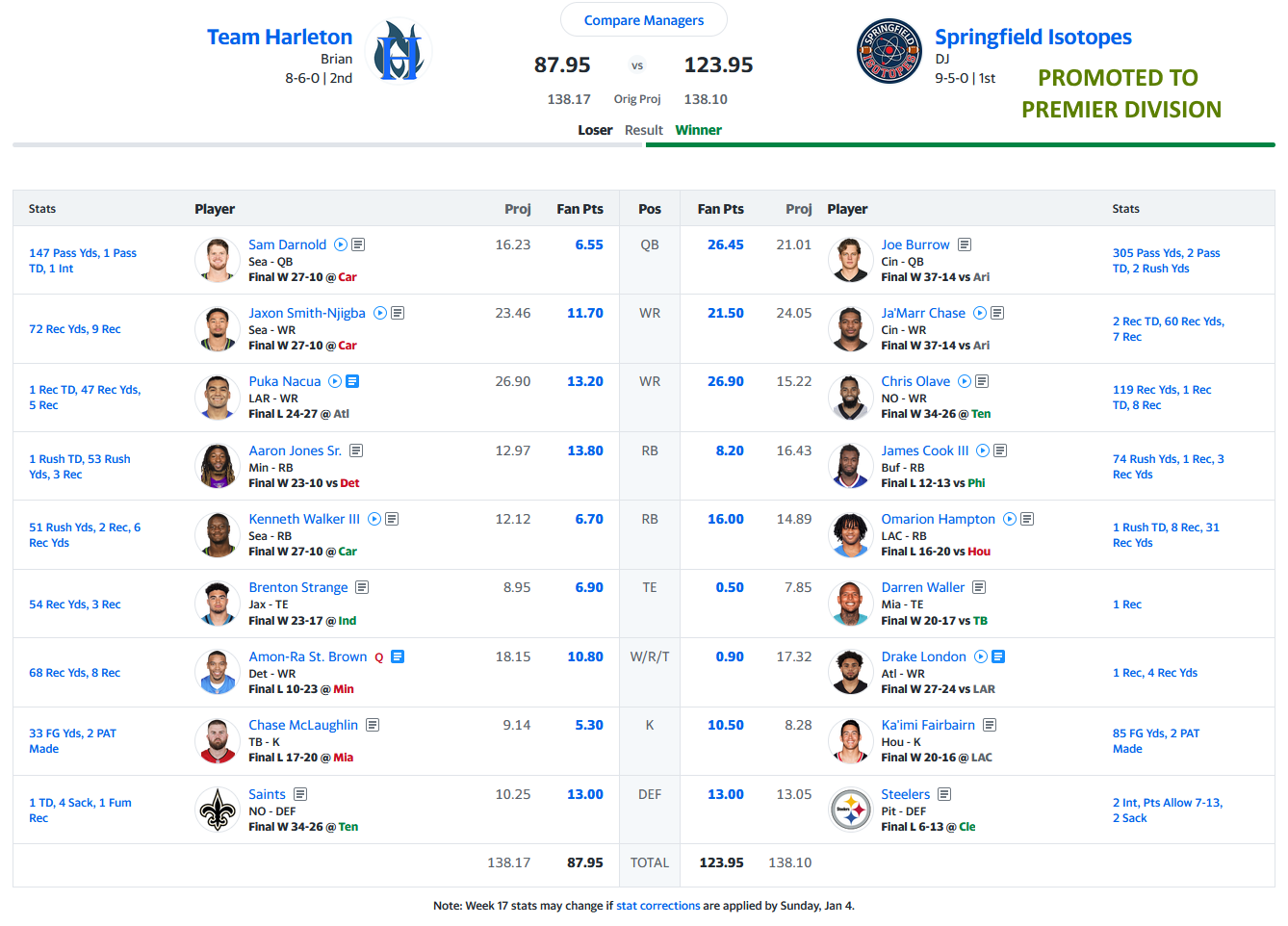 ![]() #1 Puka Nacua344.5 pts | #2 | Jaxon Smith-Njigba 344.0 pts (21.5 ppg) | ![]() |
